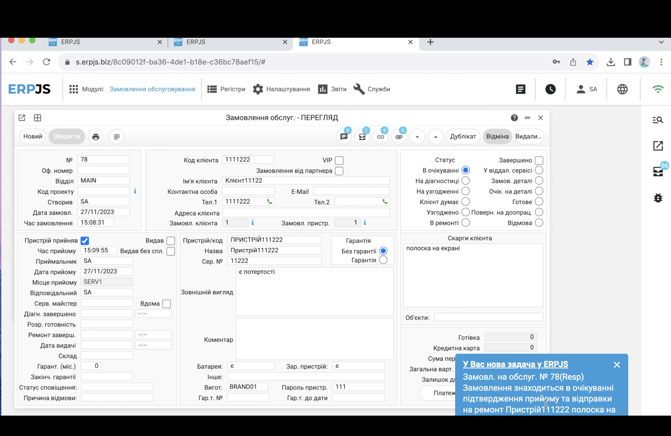 ERPJS пропонує повнофункціональне ERP-рішення, дозволяє приймати заявки на сервіс, розподіляти їх поміж майстрами, обраховувати собівартість ремонту за допомогою Таблиць робіт, вести взаєморозрахунки по замовленням, знати історію приладів за серійним номером чи історію звернень клієнта.